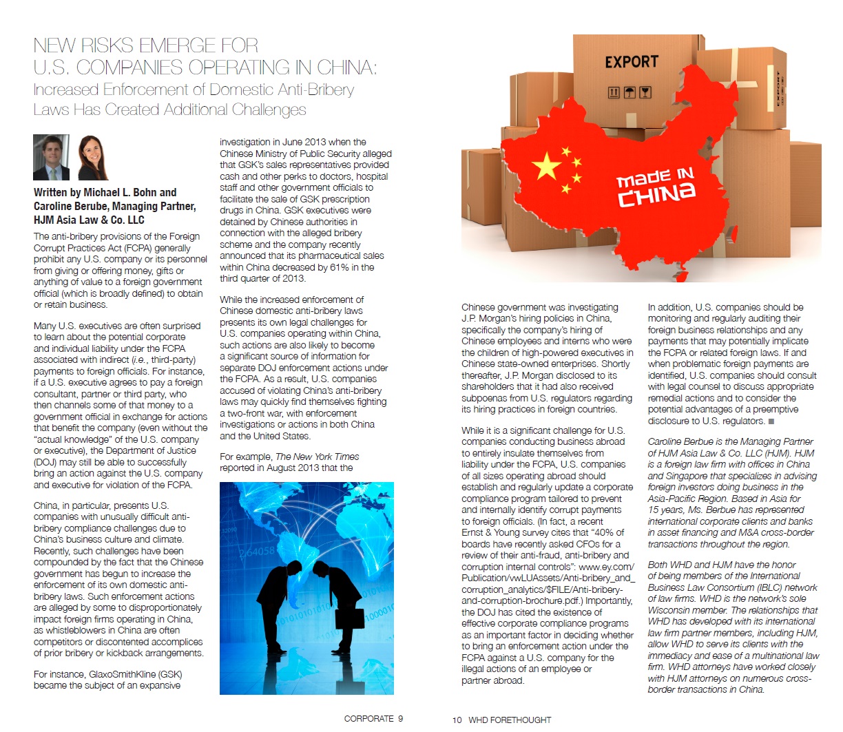 An article authored by Michael L. Bohn, Whyte Hirschboeck Dudek (WHD) and Caroline Berube, HJM Asia Law & Co LLC, titled “New Risks Emerge for U.S. Companies Operating in China: Increased Enforcement Of Domestic Anti-Bribery Laws Has Created Additional Challenges” was published in the latest WHD’s newsletter. You can view the complete article here.